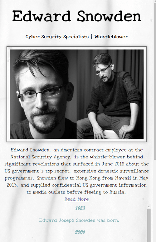 Responsive web page with bio and timeline of Cyber Security Specialist, Edward Snowden using CSS and HTML.